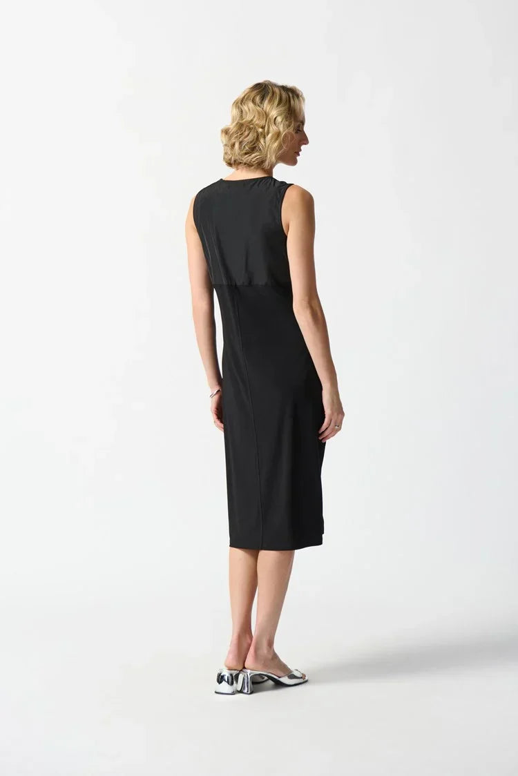 Discover this solid silky knit cocoon dress that blends comfort and style seamlessly. Featuring pockets and a yoke at the back, it's both functional and chic. The V-neckline and sleeveless design add elegance, while flatlock seams create a unique touch. Buttons on the pockets' corners complete the look. Unlined and versatile, this dress is perfect for your fashion-forward outings!