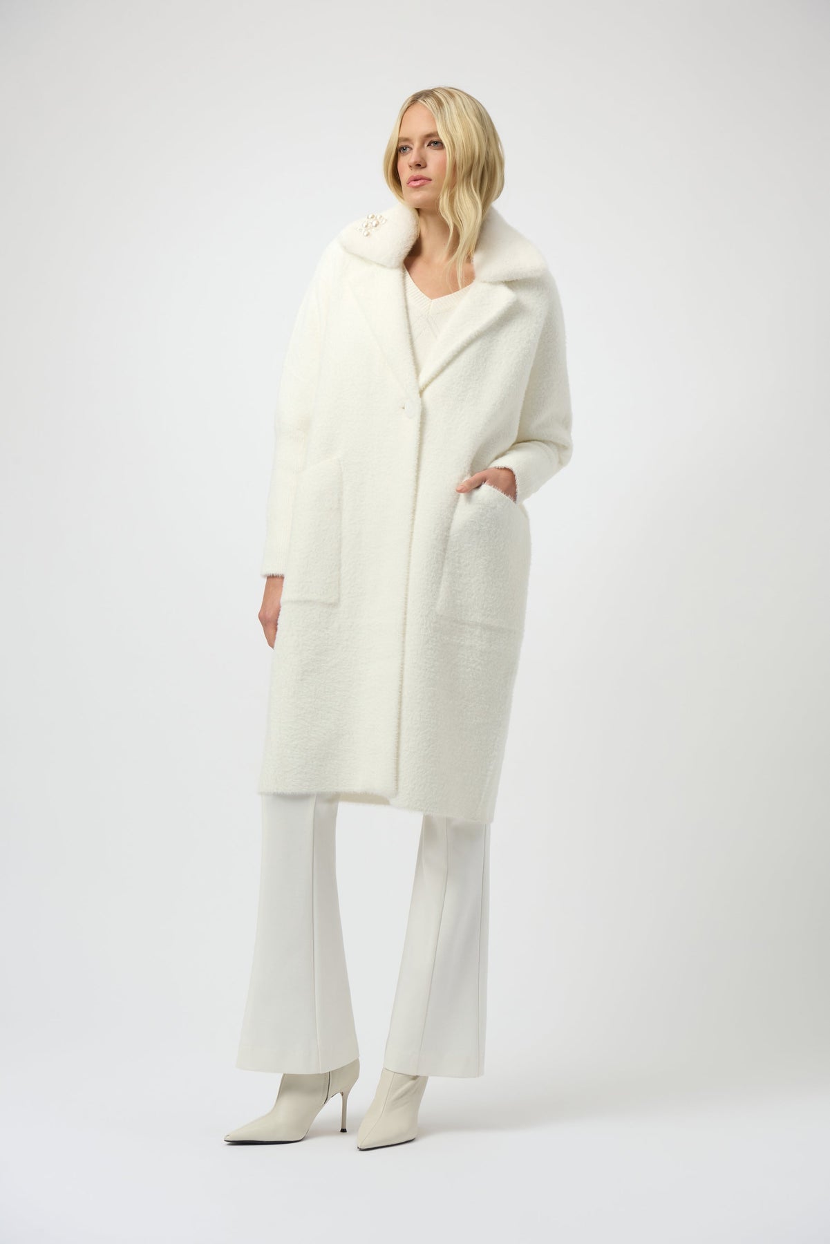 A detachable faux fur collar and cuffs add an opulent touch to this sweater coat, while the notched collar and patch pockets lend timeless sophistication. Crafted from soft feather yarn with a beautifully draped silhouette, it’s an elegant choice for cooler days.