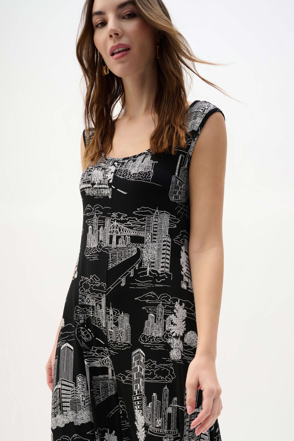 Playful and fluid, this silky knit jumpsuit showcases a conversational print with a scoop neckline and easy pull-on design. Sleeveless with side pockets and culotte legs, it offers effortless movement in an ankle-length finish.